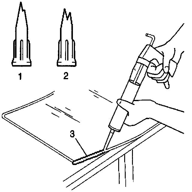 14. Apply the windshield urethane adhesive (3) using a caulking gun. Hold the gun perpendicular to the surface.