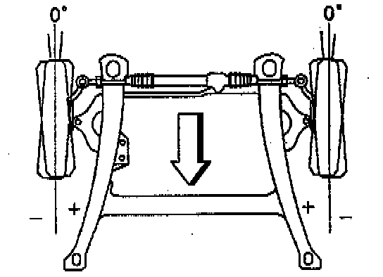 Toe-in is the turning in of the wheels from the geometric centerline/thrust line. Toe-out is the turning out of the wheels from the geometric centerline/thrust line. The purpose of toe is to ensure the parallel rolling of the wheels. Also, toe serves to offset the small deflections of the wheel support system which occur when the vehicle is rolling forward. Even when the wheels are set to toe-in or toe-out, the wheels tend to roil parallel on the road when the vehicle is moving.