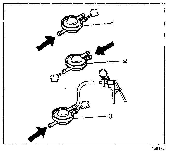 2. Blow hard into the hose. Air should pass slowly through to the side marked CAN of the fuel tank pressure control valve (1).