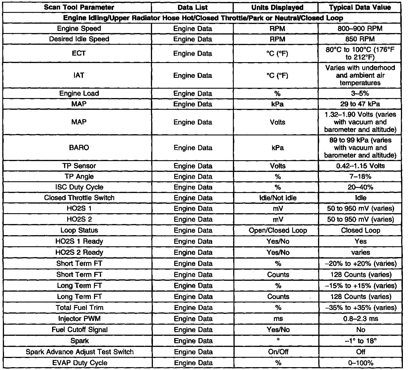 The scan tool data parameters listed below are the only parameters referenced in this service manual for use in diagnosis. If all scan tool data values are within the typical ranges described below, refer to Symptoms for additional diagnosis. Testing and Inspection