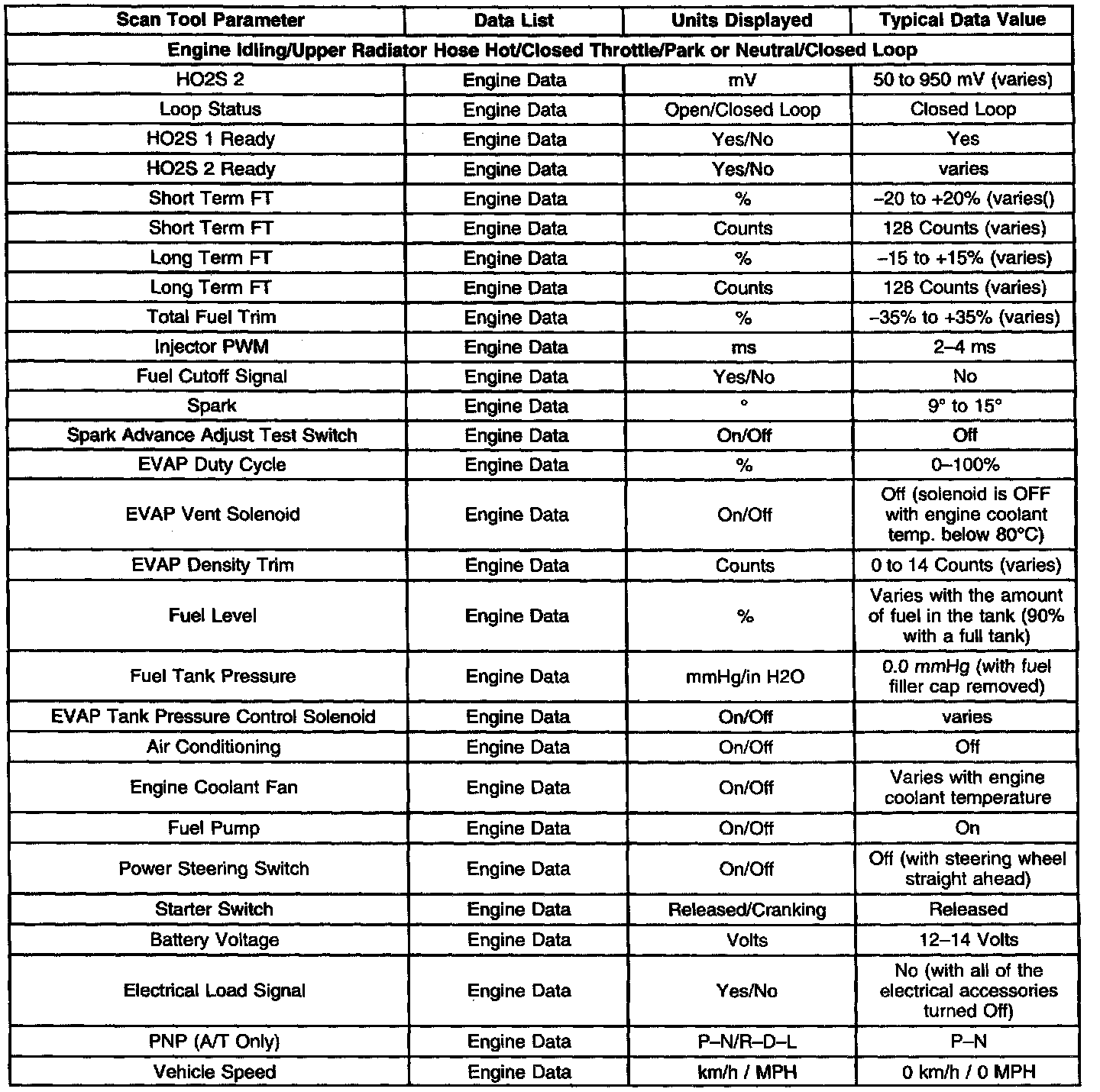 The Engine Scan Tool Data List contains all engine related parameters that are available on the scan tool. The list is arranged in the order shown on the scan tool.