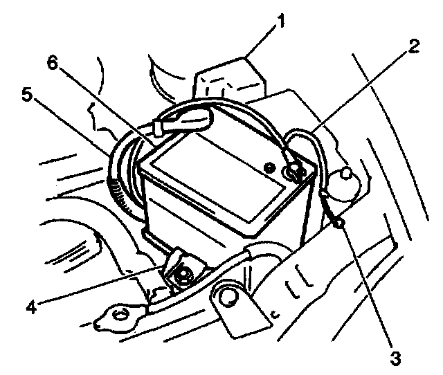 3. Remove one bolt and the hold down bracket (4) from the battery carrier.