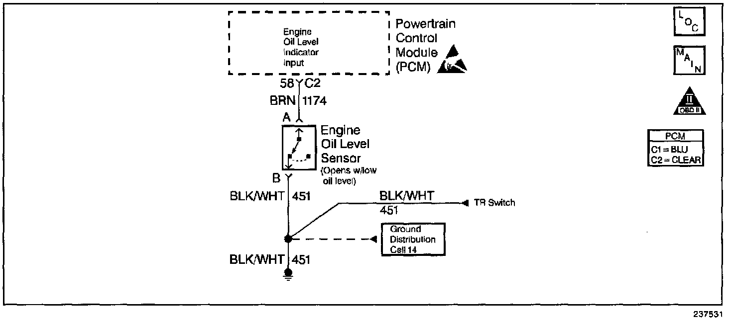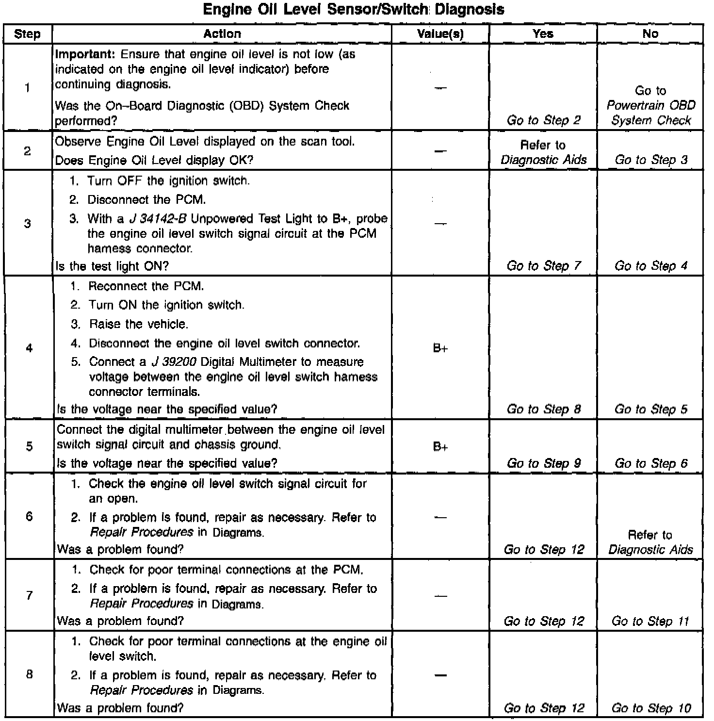 ^ Poor connection at PCM or oil level sensor. Inspect harness connectors for backed out terminals, improper mating, broken locks, improperly formed or damaged terminals, and poor terminal to wire connection.