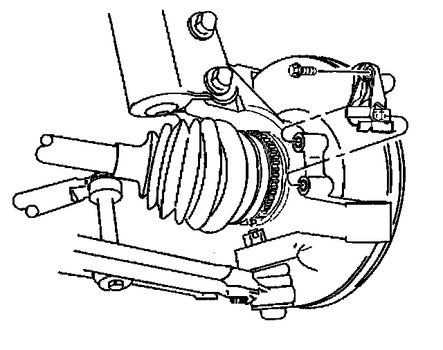 4. Remove the front wheel speed sensor. If the sensor will not slide out of the knuckle, remove the brake rotor and use a blunt punch or equivalent tool in order to push the sensor from the back side of the knuckle.
