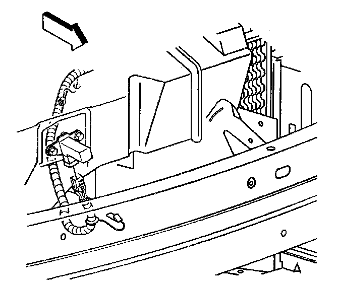 1. Install the Inflatable Restraint Front End Discriminating Sensor (1) to the hood latch support bracket (3).
