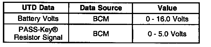 The scan tool displays UTD data. This information assists in determining if the BCM is able to receive the correct data to operate the UTD system. By monitoring the data from various systems, it will determine if the BCM is sending or receiving the proper data to and from a particular system. The BCM uses data received from other systems in order to carry out UTD functions. Therefore, if the BCM receives the incorrect data from another system, the BCM may function improperly. Use the scan tool in order to review the UTD data from the system or systems responsible for that UTD data. The following table describes where to access scan tool data that affects UTD operation Refer to the applicable section for scan tool data definitions.