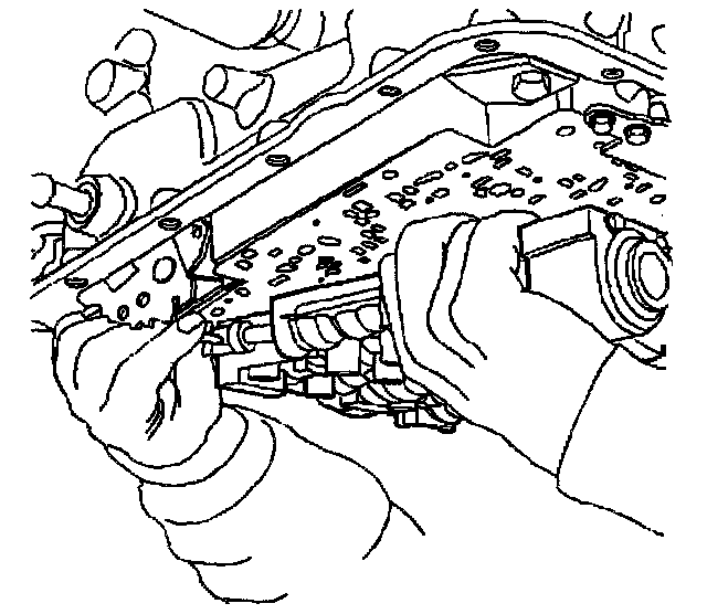 15. Carefully begin to lower the control valve body down from the transmission case, disconnect the manual valve link, then remove the control valve body from the transmission case.