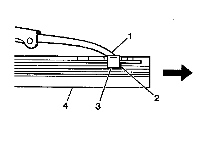 2. The wiper blade element (4) has two notches at one end which are engaged by the bottom claw set (3) of the wiper blade (1). At the notched end of the wiper blade (2), pull the blade element from the wiper blade (1).