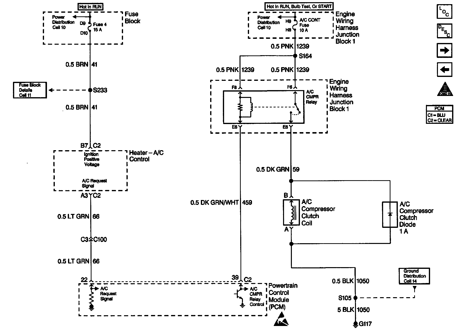 When an A/C mode is selected, the A/C control head or the A/C programmer supplies a 12 volt signal to the PCM A/C request input. The A/C compressor clutch relay is controlled by the PCM. The PCM provides a ground path for the A/C relay coil. When the A/C compressor relay is engaged battery voltage is supplied to the compressor clutch coil. The PCM will enable the A/C compressor clutch whenever the engine is running and the A/C has been requested unless one or more of the following conditions are present: