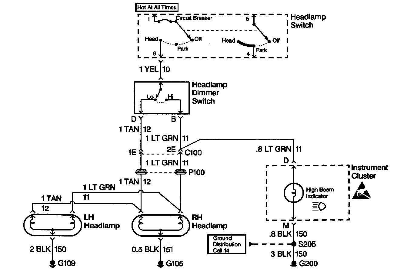 At this point analyze and (diagnose the problem), and develop text. Since the high beam indicator illuminated when the headlamp dimmer switch was in the high position, the high contacts of the headlamp dimmer switch and the LT GRN wire between the headlamp dimmer switch and C100 are good. At this point, it is extremely unlikely that the high beam filaments in the RH and LH headlamps are both open or that both headlamp connections are bad. The cause must be a bad connection at C100 or an open in the LT GRN wire between C100 and the RH headlamp.