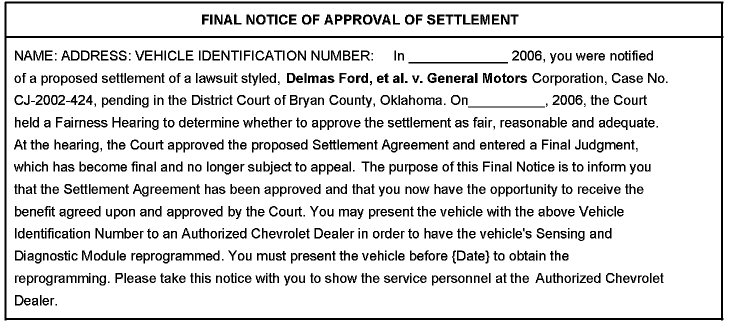 The purpose of this bulletin is to provide GM Dealers with information about Class Action Settlement CJ-2002-424 for certain 1997, 1998 and 1999 Chevrolet Malibu and certain 1997, 1998 and 1999 Oldsmobile Cutlass vehicles. As part of the settlement, GM has agreed to reprogram the air bag sensing and diagnostic module (SDM) at no cost to the customer.