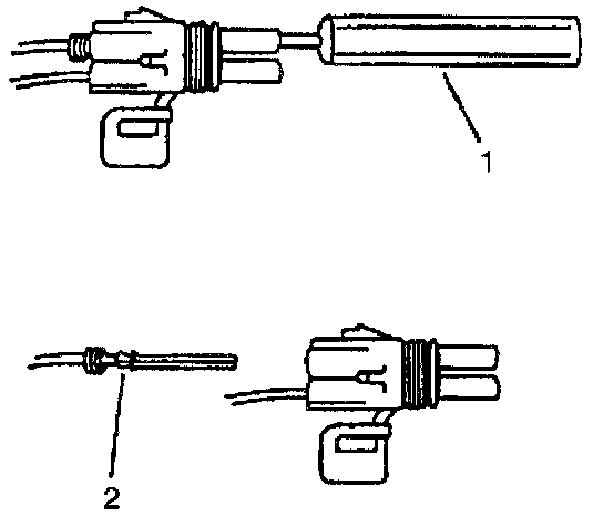^ Insert the Weather Pack(R) terminal removal tool into the front (mating end) of the connector cavity until it rests on the cavity shoulder (1).