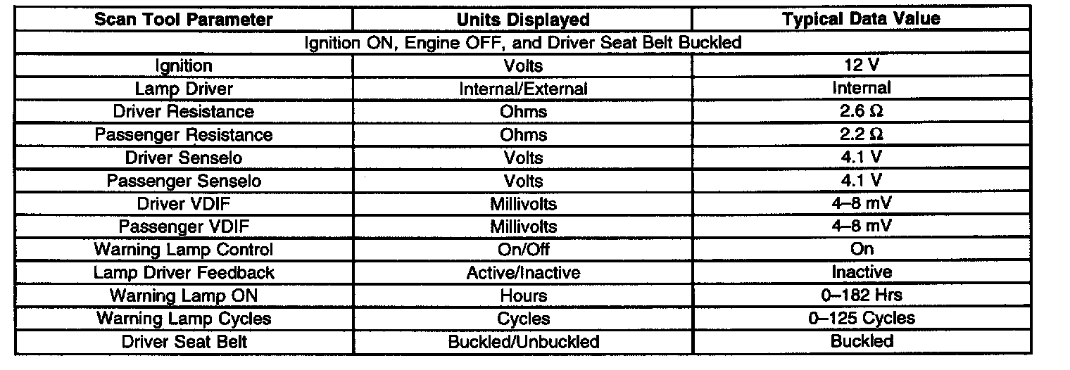 The SIR Scan Tool Data List contains all Restraint related parameters that are available on the scan tool. The list is arranged in the order as they appear on the scan tool.