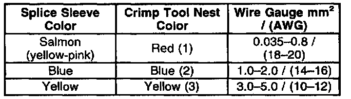 4. Select the proper sealed splice sleeve according to the wire size. Refer to the above table at the beginning of the repair procedure for the color coding of the splice sleeves and the crimp tool nests.