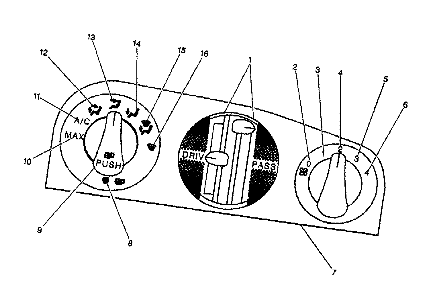 The knobs and the levers on the control head (7) regulate the operation of the A/C system. The A/C system temperature can also be regulated for driver and front passenger individually, by use of slide levers in the center of the control (1). The compressor clutch and the blower connect electrically to the control head by the wiring harness. The blower circuit is open in the off mode. The four blower speeds, available in the remaining modes, provide the air flow.