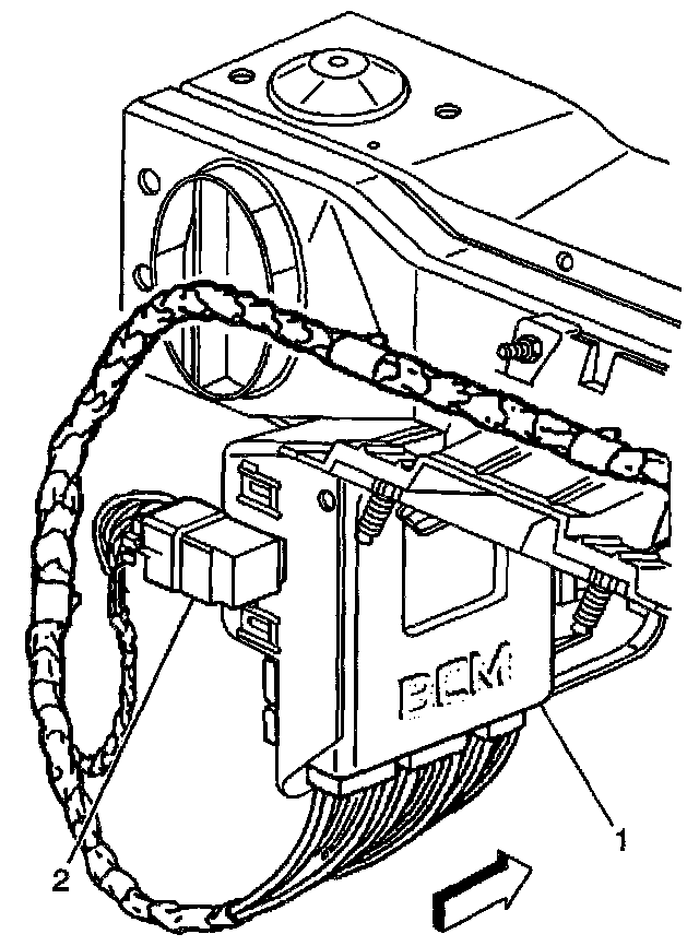 2. Use pressure tabs in order to release the EBCM (1) from the EBCM bracket (2).