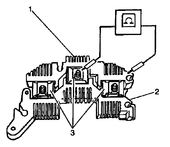 4.1.1. There should be continuity in one direction between each of the 3 phase clips (3) and the grounded heat sink (1). When the polarity of the digital multimeter is reversed, all 3 readings should show open circuits.