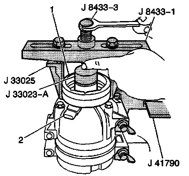 7. Install the J 8433 onto the compressor clutch coil (1) and tighten the puller leg bolts.