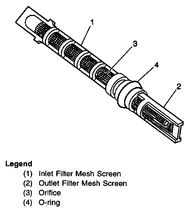 The plastic expansion (orifice) tube, with its mesh screen and orifice is located in the forward end of the evaporator tube - rear. The expansion (orifice) tube provides a restriction to the high pressure liquid refrigerant in the liquid line, metering the flow of refrigerant to the evaporator as a low pressure liquid.