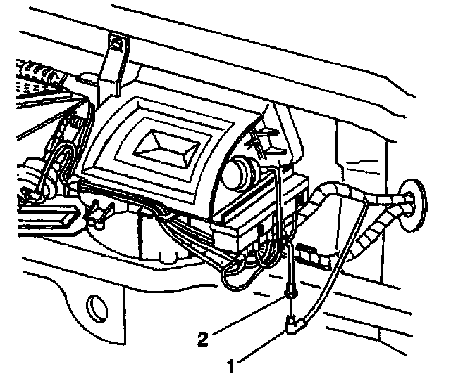 44. Disconnect the IP harness vacuum source line (1) from the HVAC module vacuum harness (2).