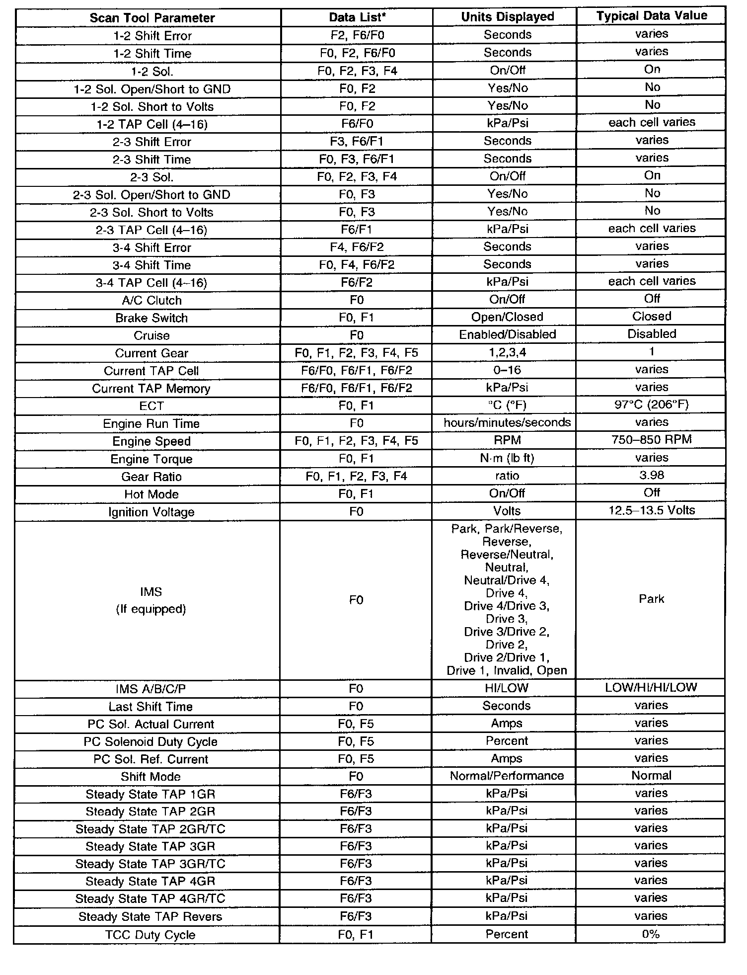 Only the parameters listed below are used in this manual for diagnosing. If a scan tool displays other parameters, the values are not recommended by General Motors for use in diagnosis. Scan tool values below were recorded under the following conditions:
