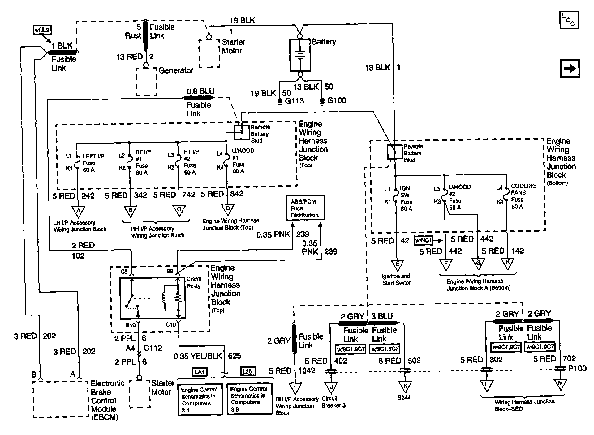 Power Distribution Schematics: Battery, EBCM, Engine Wiring Harness Junction Blocks (Bottom And Top), Fusible Links, Generator, Remote Battery Stud And Starter: