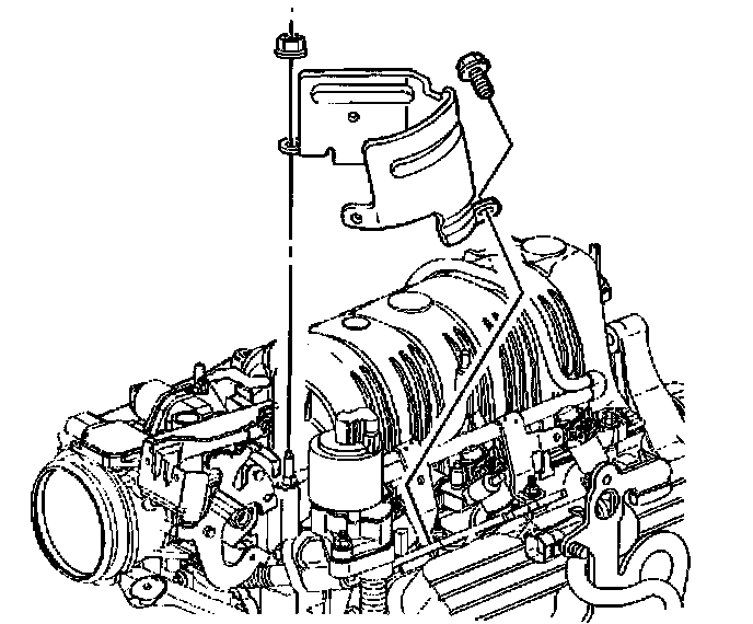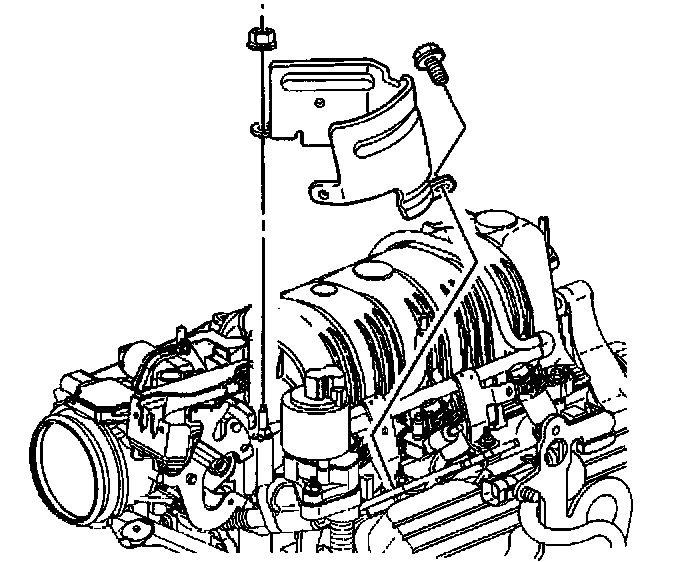 11. Install the EGR shield and the EGR valve wiring harness heat shield nut and bolt to the upper intake manifold.