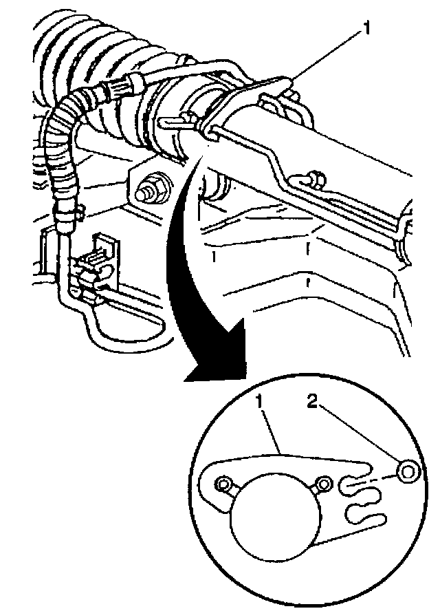7. Remove the power steering pressure line (2) from the clamps (1) on the power steering gear.