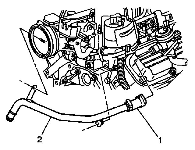 2. Loosen and lower AIR pump exhaust hose pinch clamp (1).