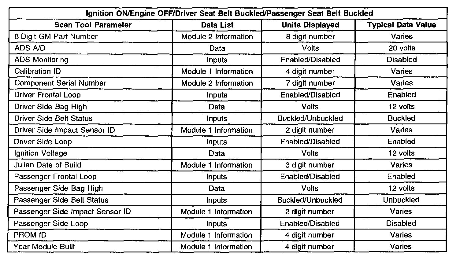 The SIR scan tool data list contains all the restraint system related parameters that are available on the scan tool. The parameters in the list are arranged in alphabetical order. The column, "Data List," indicates the location of the parameter within the scan tool menu selections.