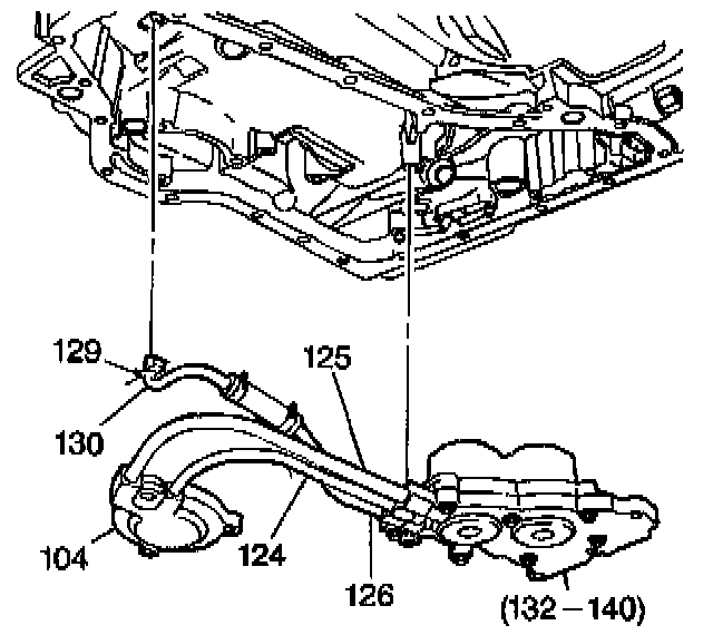 7. Remove the accumulator (132) and the manual 2-1 band servo cover (104) as a assembly.