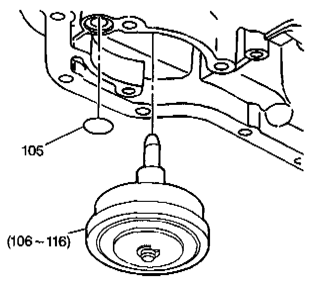 5. Remove the manual 2-1 band servo cover bolts (103) from the 2-1 band servo (104).