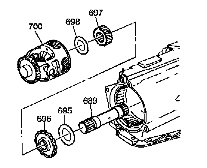 1. Assemble the sun gear thrust bearing (698), the differential carrier sun gear (697), the park gear (696), the internal gear thrust bearing (695) and the sun gear shaft (689) into the differential carrier (700).