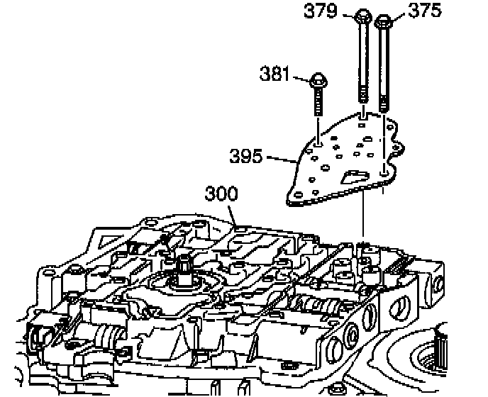 2. Install the control valve body bolts (375, 379, and 381) that mount the fluid pressure manual valve position switch to the control valve body (300).
