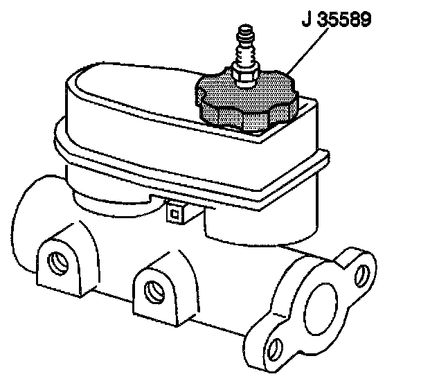 4. After making sure tank valve is off, to prevent spray of fluid from air pressure in the line. Connect the J 35589 to the brake fluid reservoir.