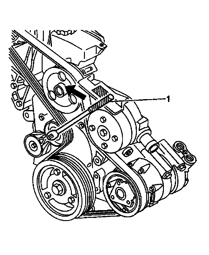 3. Install the drive belt under the drive belt tensioner pulley by lifting or rotating the drive belt tensioner, using a 3/8-inch breaker bar (1).