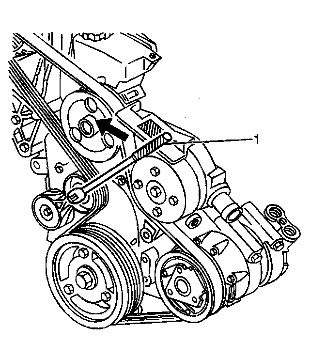 2. Remove the drive belt tension by lifting or rotating the drive belt tensioner off of the drive belt, using a 3/8-inch breaker bar (1).