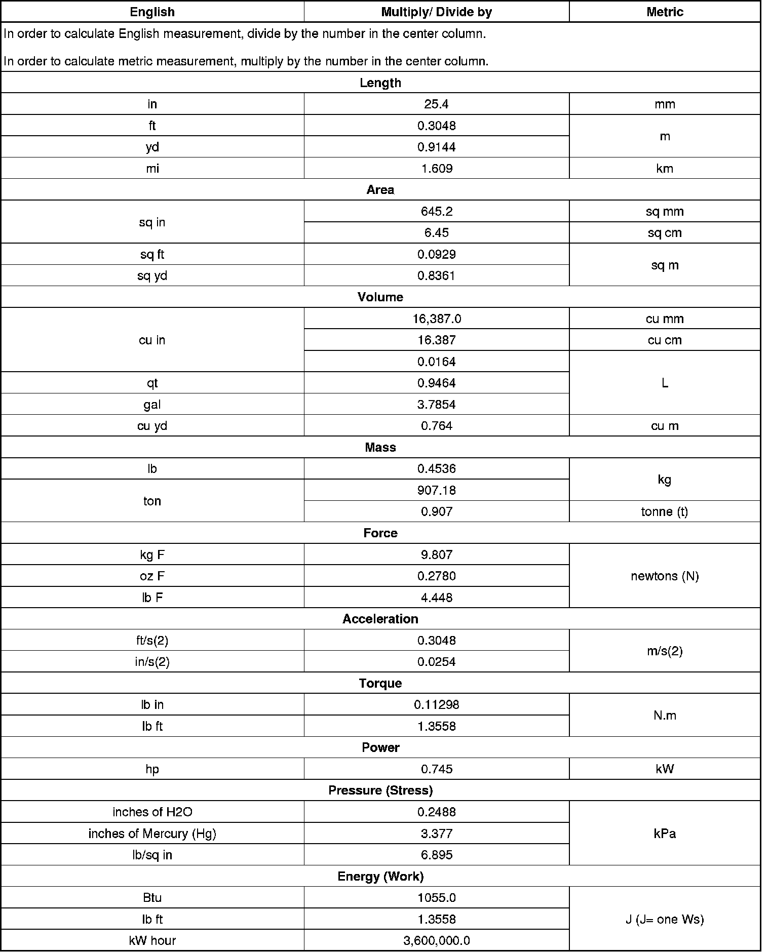 US English/Metric Conversion