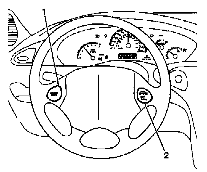 5. Remove the cruise control switch (1, 2). Pry outward with a flat bladed tool.