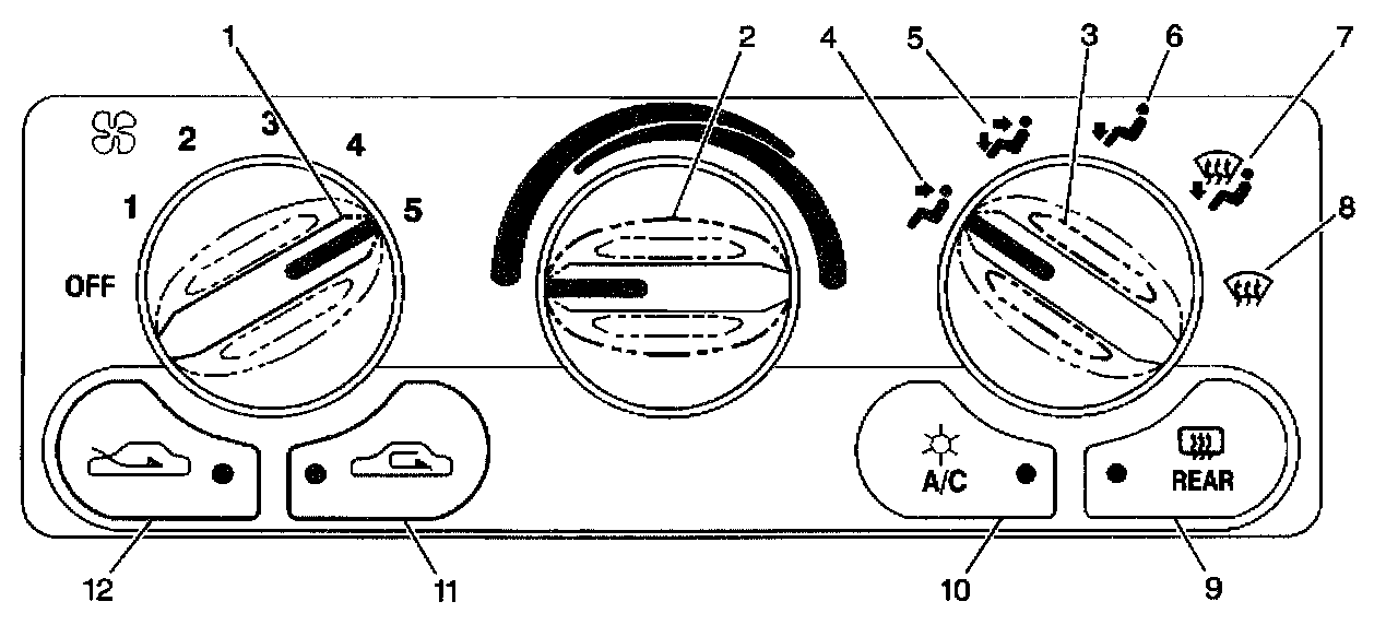 Press this button (12) to force the system to use outside air. This button is usable in all of the air delivery modes on the mode knob (3). An indicator on the button will light up when this button is selected.