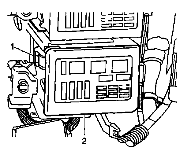 2. Release the retaining clip (1) and remove the engine wiring harness junction block (BOTTOM) cover (2).