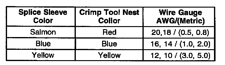 Use crimp and seal splice sleeves to form a one-to-one splice on all types of insulation except tefzel and coaxial to form a one-to-one splice. Use tefzel and coaxial where there is special requirements such as moisture sealing. Follow the instructions below in order to splice copper wire using crimp and seal splice sleeves.Crimp and Seal Splice Table: