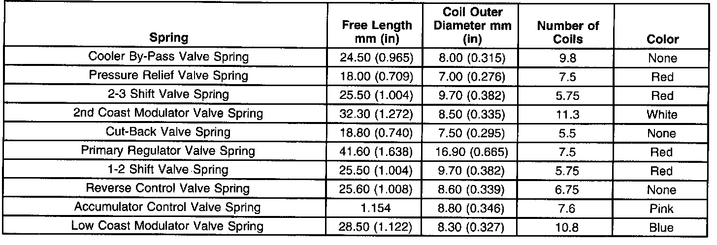 Lower Valve Body Spring Specifications
