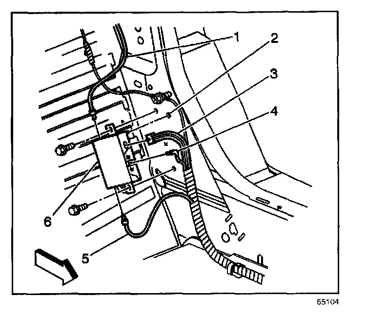 5. Remove the screws retaining the antenna module (6) to the lock pillar.