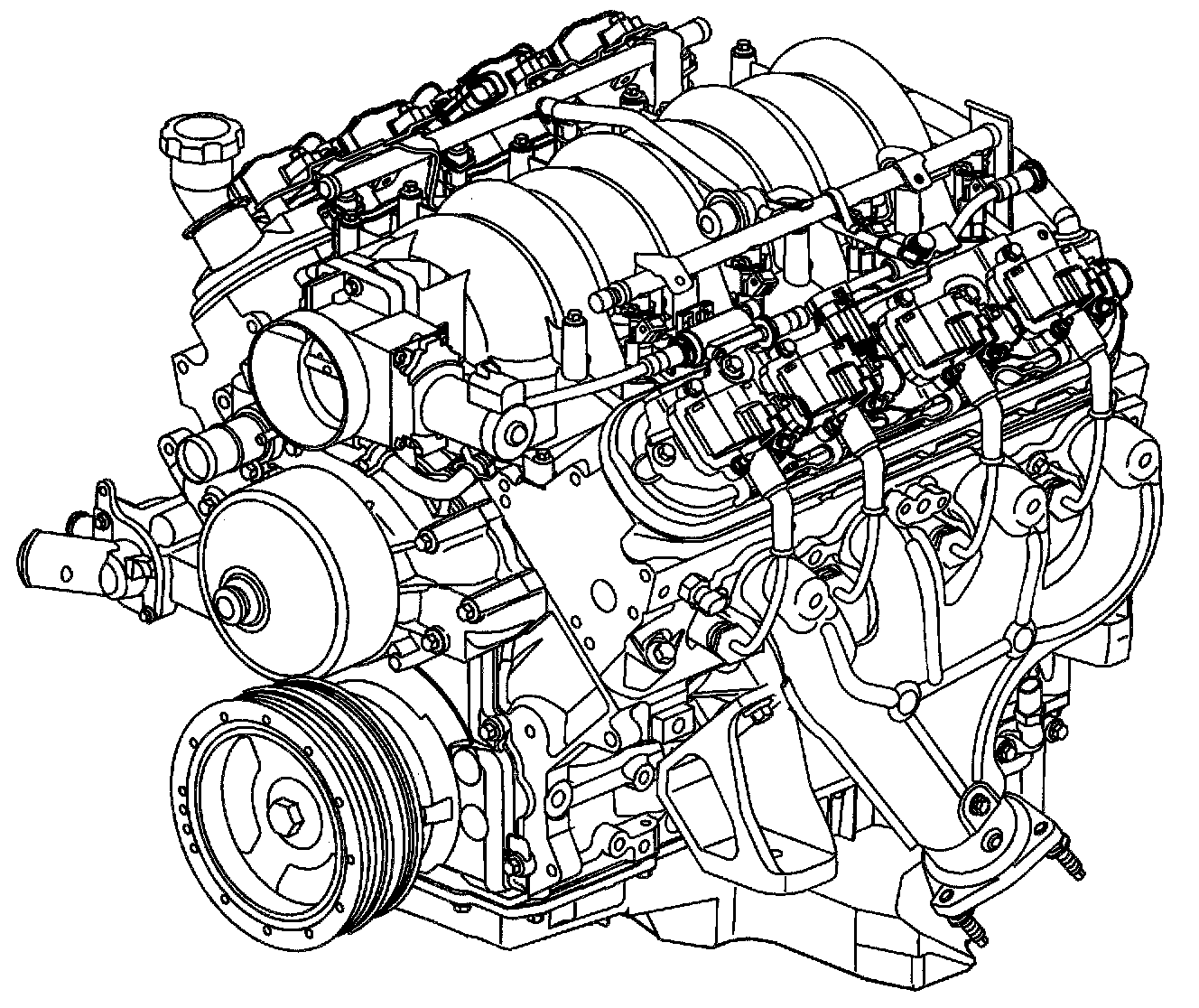 The engine block is a cam-in-block deep skirt 90 degree V configuration with five crankshaft bearing caps. The engine block is aluminum with cast in place iron cylinder bore liners. The five crankshaft bearing caps each have four vertical M10 and two horizontal Me mounting bolts. The camshaft is supported by five camshaft bearings pressed into the block.