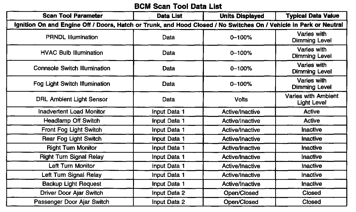 BCM Scan Tool Data List: