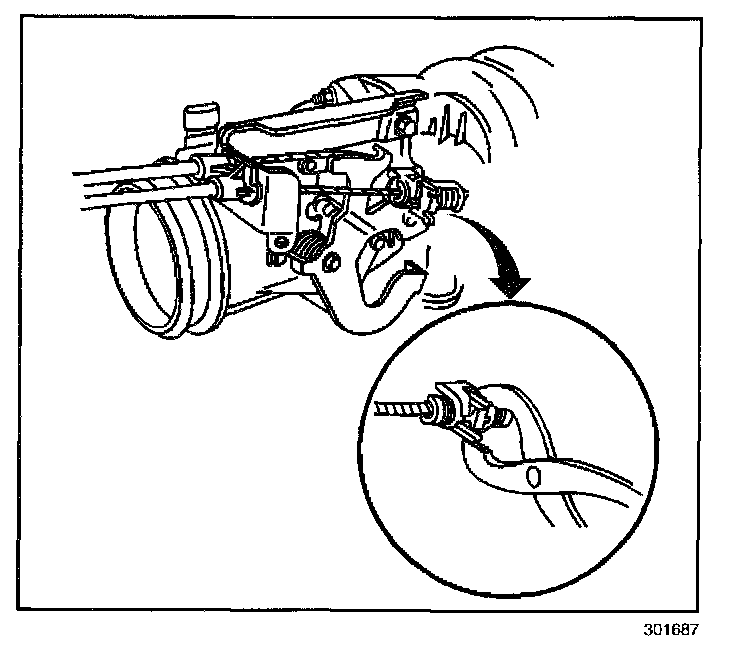 5. Install the cruise control cable to the throttle lever and the accelerator control cable bracket.