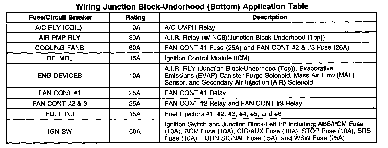Wiring Junction Block-Underhood (Bottom) Application Table (Part 1 Of 2):