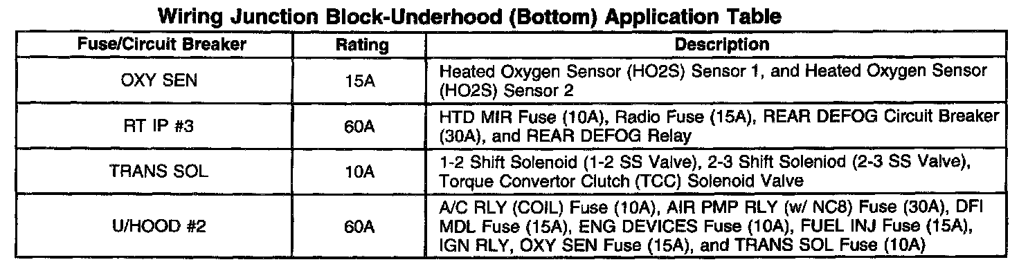 Wiring Junction Block-Underhood (Bottom) Application Table (Part 2 Of 2):