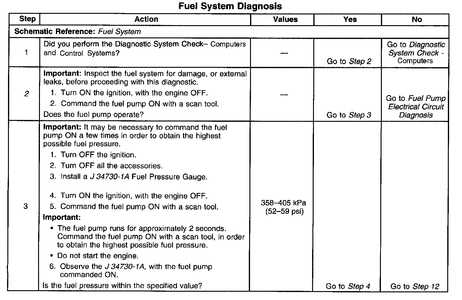 14. This step tests for a restricted fuel return pipe. If the fuel pressure is within the specified values, a restriction in the fuel return pipe is indicated.